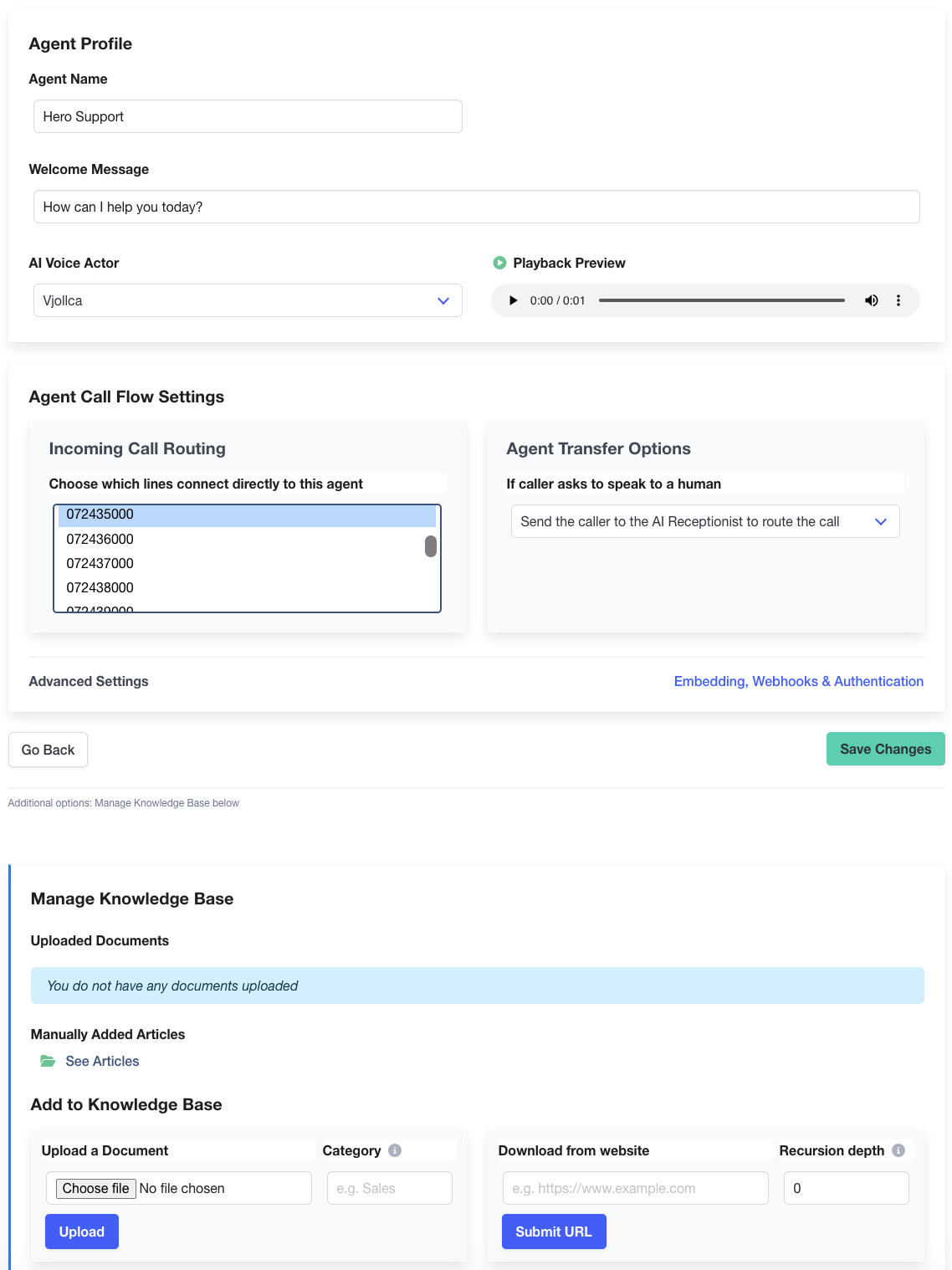 Train up your own AI Agents from your knowledge base to answer phone calls for customers.