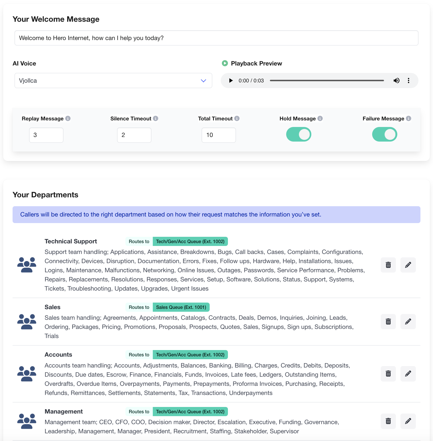 Automatically direct inbound callers to the right department with voice recognition and AI voice chat.