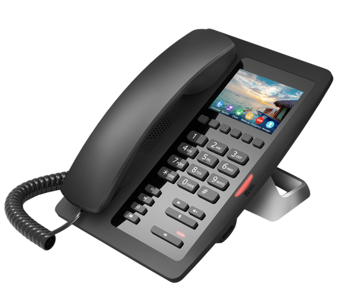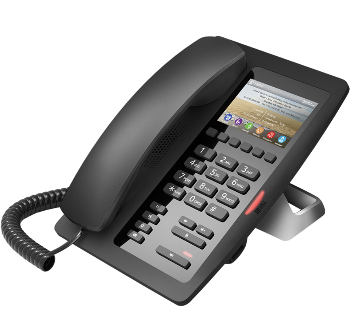 Fanvil H5 (Black) Wi-Fi capable phone (MOQ APPLYS) has a 3.5inch colour screen, 6 editable shortcut keys, a USB mobile phone charging port, call/message indicator lamp x1, Handsfree indicator lamp, call transfer voice message (PSU not included)