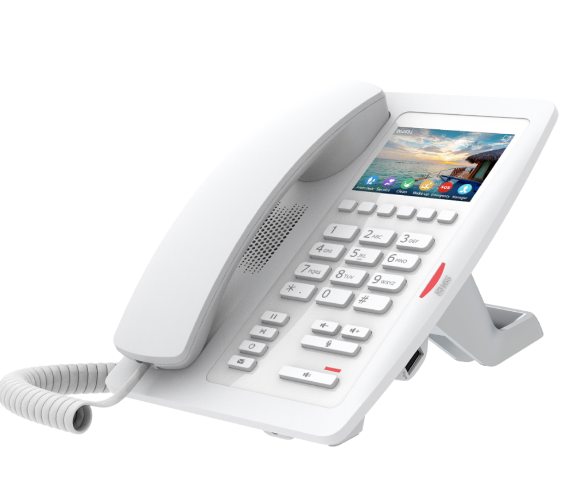 Fanvil H5 White has a 3.5inch colour screen, 6 editable shortcut keys, a USB mobile phone charging port call/message indicator lamp x1, handsfree indicator lamp, call hold, call transfer voice message. (PSU not included)