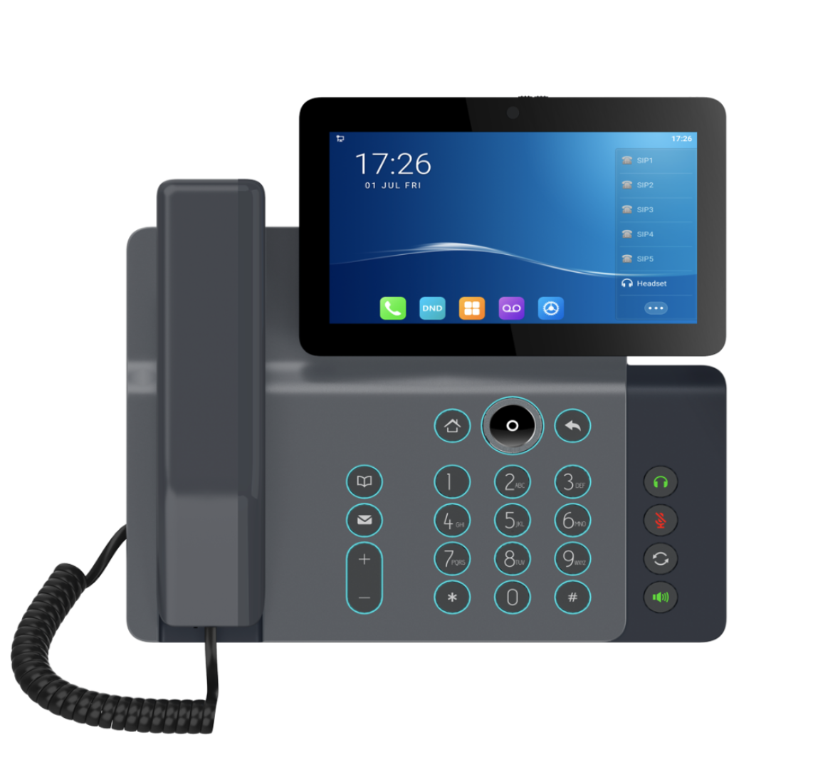 Fanvil V67 android phone with 20 lines, video capable, comes with developer kit, 7 inch touchscreen, 1080p camera, customisable backlight, built in WiFi & Bluetooth, HD audio handset & speaker with noise reduction and antibacterial surfaces